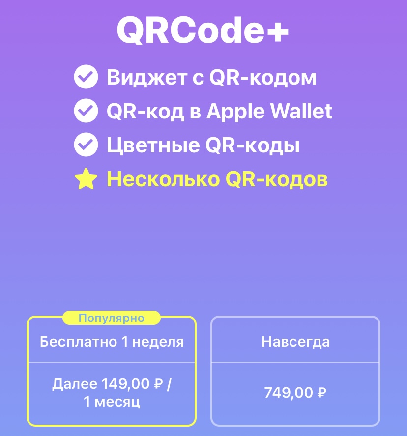 Мобильное приложение, которое доступно только для пользователей iOS. Приложение имеет простой интерфейс и достаточно понятное даже для новичка. Его суть в том, что QR код хранится на главном экране в виде виджета. Больше не нужно открывать разные приложения, чтобы предоставить код для сканирования. Достаточно просто разблокировать экран, на котором уже будет представлен виджет QR кода.