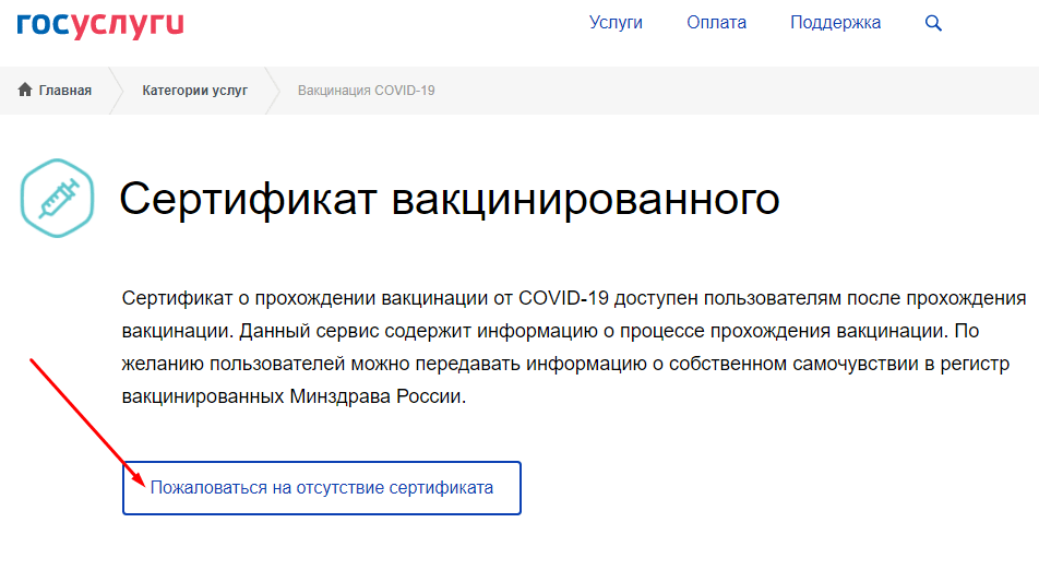 Если же вы сделали обе прививки, но вместо сертификата видите такую же картинку, то следует нажать на кнопку под сообщением — «Пожаловаться на отсутствие сертификата»