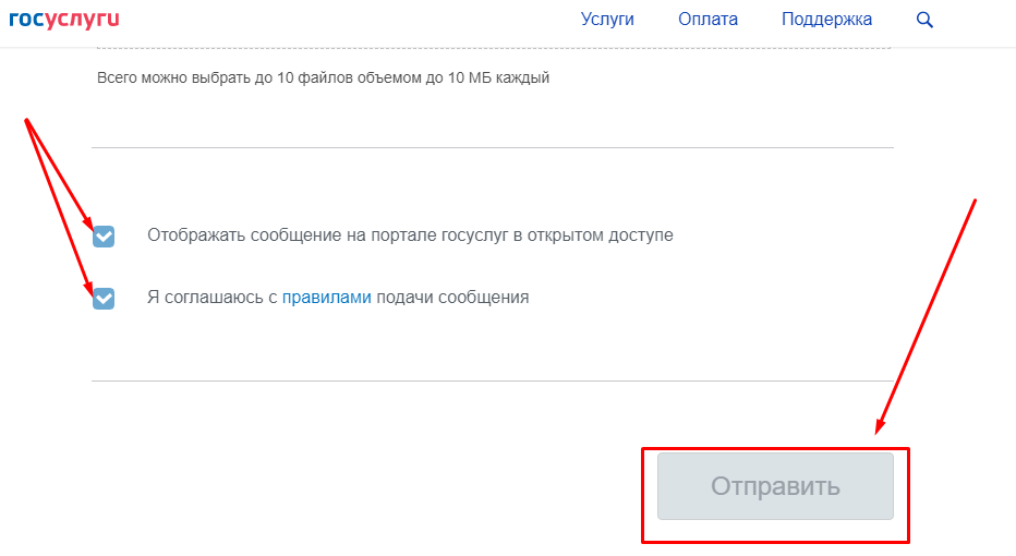 В конце страницы не забудьте нажать на галочки около фраз «Отображать сообщение на портале госуслуг в открытом доступе» и «Я соглашаюсь с правилами подачи сообщения» и кнопку «Отправить».