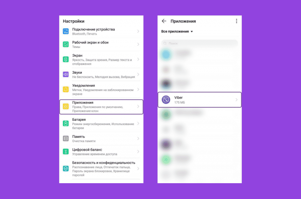 Далее найдите список с приложениями (внизу) и выберите Вибер. Теперь осталось только переключить бегунок, чтобы сигналы стали беззвучными.