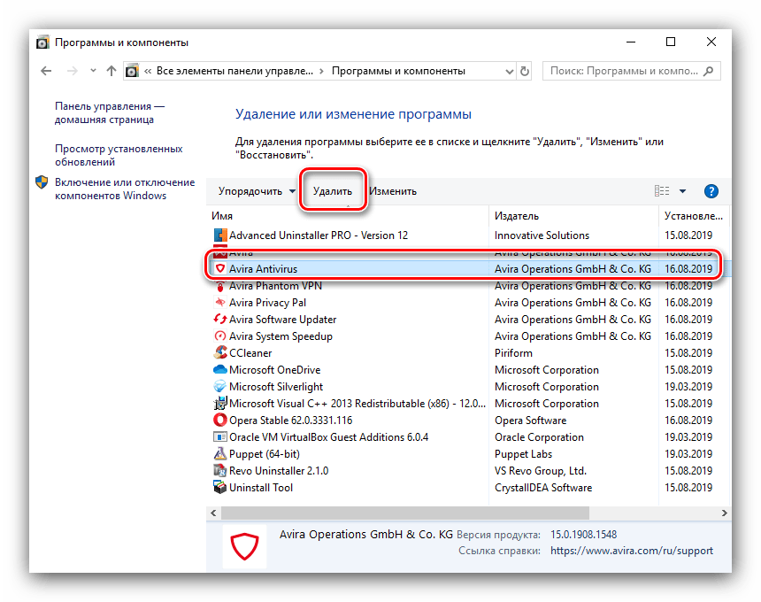Ищем Авиру (она будет называться по-английски – Avira). Кликаем по ней левой кнопкой мыши, затем нажимаем кнопку в верхней части окна: «Удалить».
