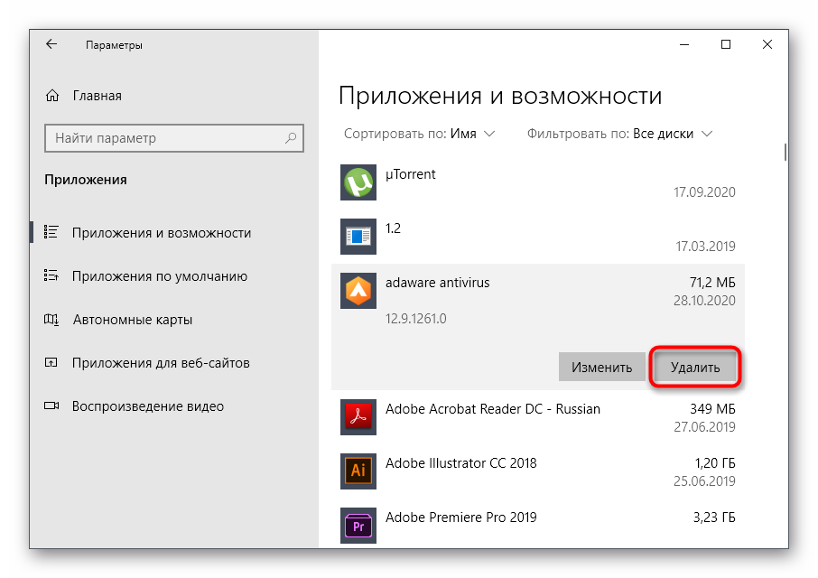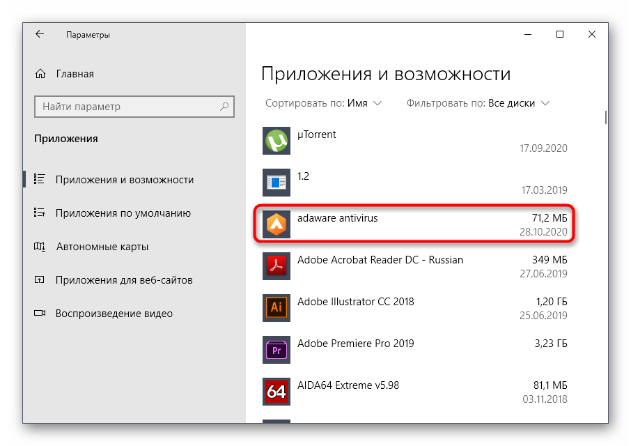 Список всех приложений в Windows 10 можно найти через «Параметры», где и находится инструмент, позволяющий перейти к удалению любого софта. Рекомендуем использовать его, чтобы быстро избавиться от Adaware Antivirus, затратив минимальное количество времени.