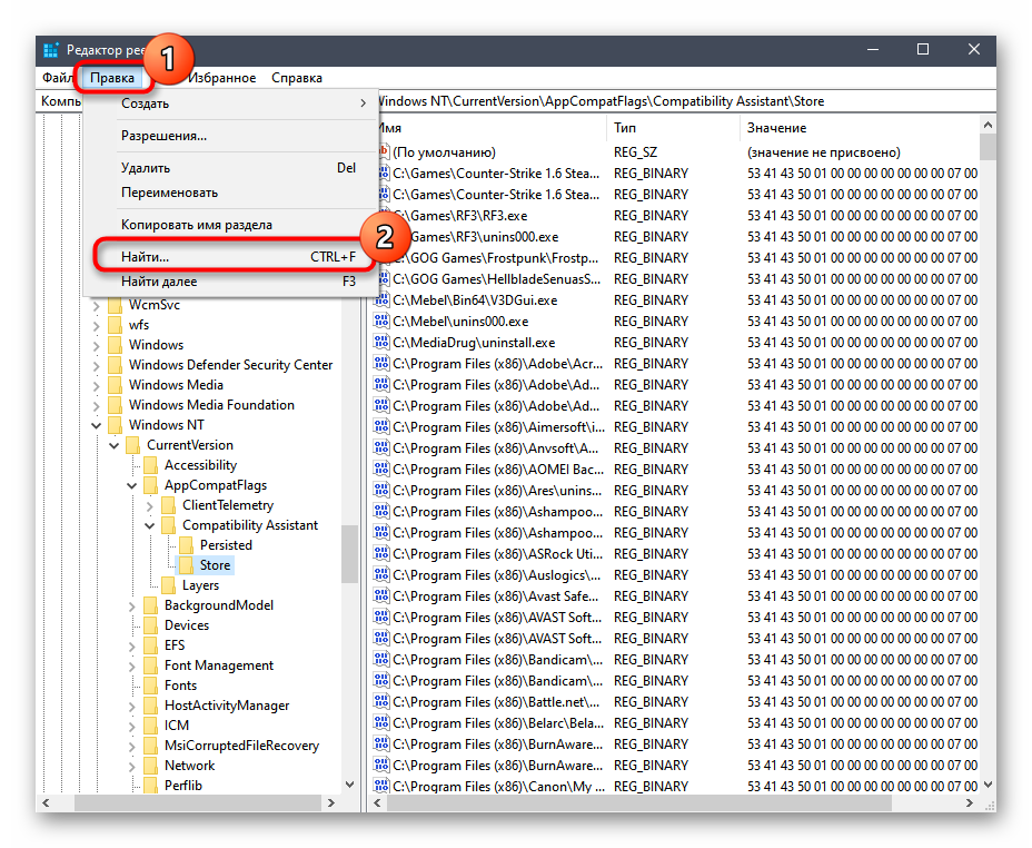 В появившемся окне «Редактора реестра» разверните выпадающее меню «Правка» и нажмите по пункту «Найти».
