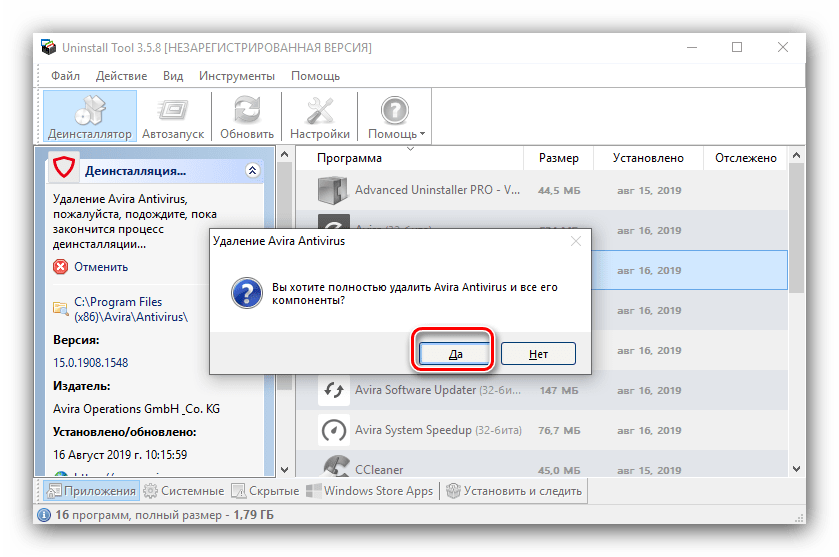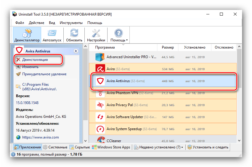 - Запустив приложение, убедитесь, что в нем открыта вкладка «Деинсталлятор» – в центре окна должен находится перечень инсталлированных приложений. Найдите в нём «Avira Antivirus», выделите соответствующую позицию и нажмите на кнопку «Удалить».