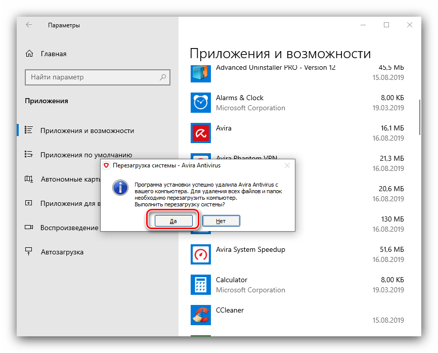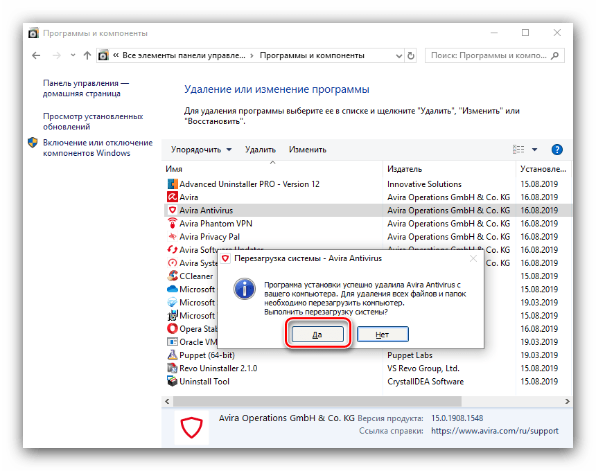 6. Удаление завершено Перезагрузите компьютер. Теперь можно повторно установить ПО Avira.