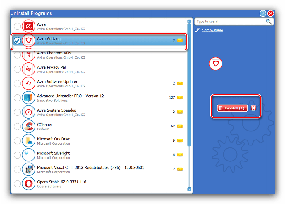 - Запустите средство, затем воспользуйтесь перечнем программ, чтобы выделить запись, соответствующую Avira Antivirus, после чего нажмите на кнопку «Деинсталляция» в левом меню.