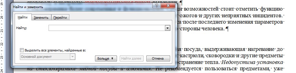 В первую очередь совершается переход на ту страницу, которая подлежит очистке. Для этого на клавиатуре одновременно нажимают клавиши «Ctrl» и «F», открывающие окно поиска и замены.