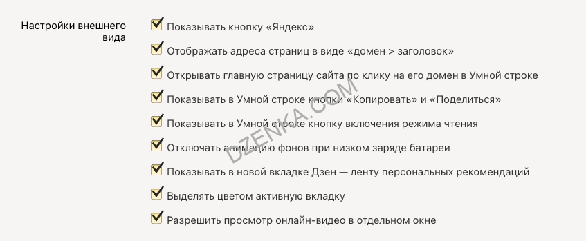 В разделе «Настройки внешнего вида» убедитесь, что напротив «Показывать в новой вкладке Дзен – ленту персональных рекомендаций» стоит «галочка».