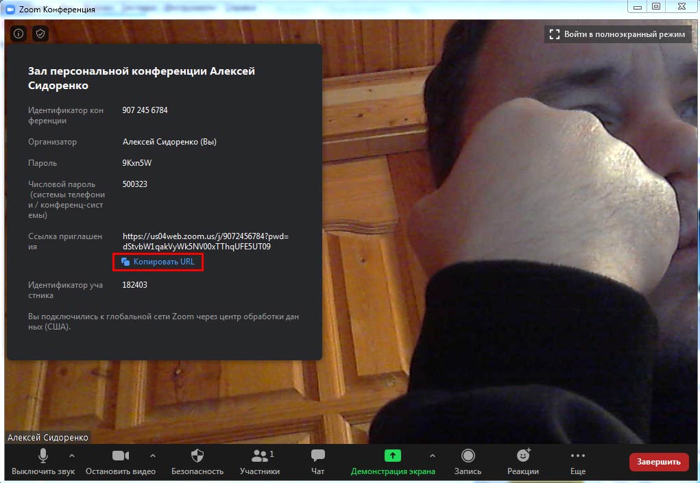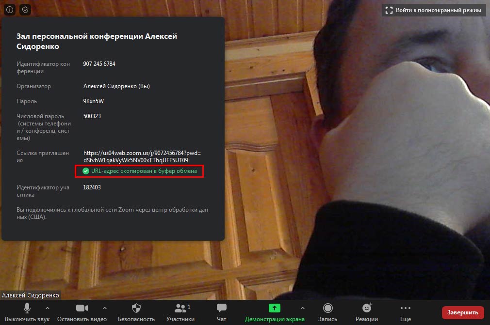 6. Откроется окно с информацией о предстоящей online-встрече. Приложение для проведения конференций отобразит организатора, пароль, числовой пароль, URL приглашения и идентификатор участника.