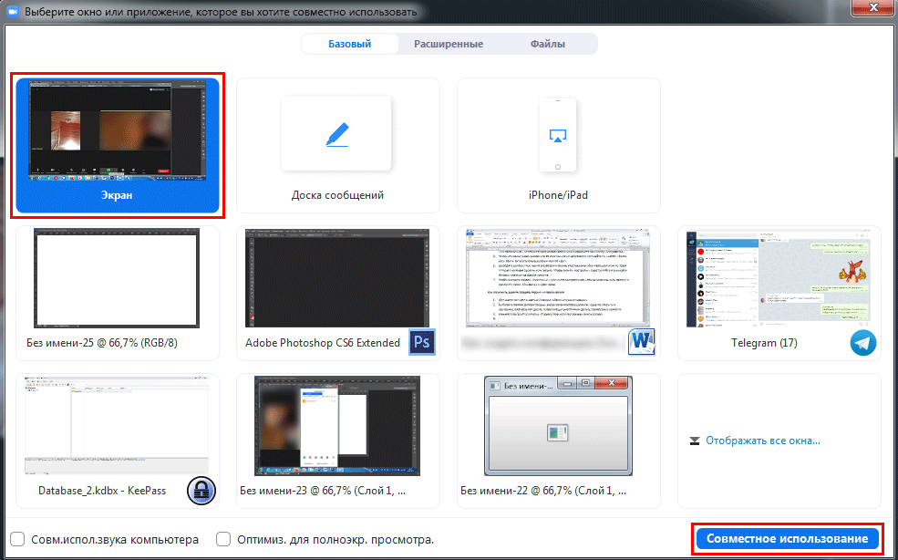Когда презентация будет открыта у вас на компьютере, перейдите в приложение Zoom и нажмите в нижнем меню на пункт “Демонстрация экрана”. Откроется окно, в котором представлены все активные на данный момент окна в операционной системе. Среди них нужно найти окно с презентацией. В нашем случае это PowerPoint приложение.