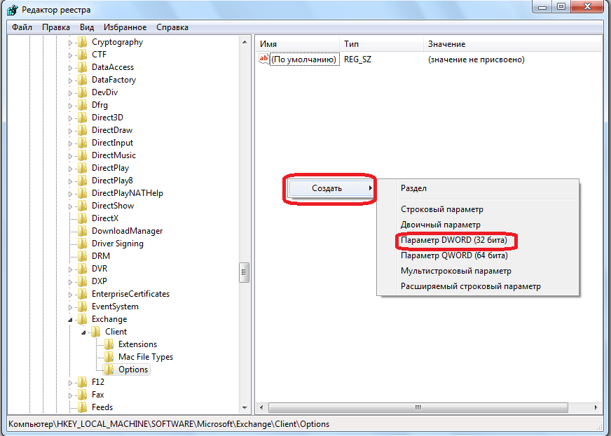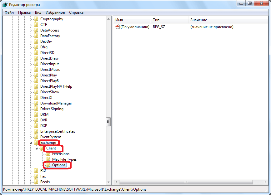 После этого, осуществляется переход в Редактор реестра Windows. Делаем переход в раздел реестра HKEY_LOCAL_MACHINE\SOFTWARE\Microsoft\Exchange\Client\Options. Если какой-то из папок нет, добиваем путь вручную, путем добавления директорий.