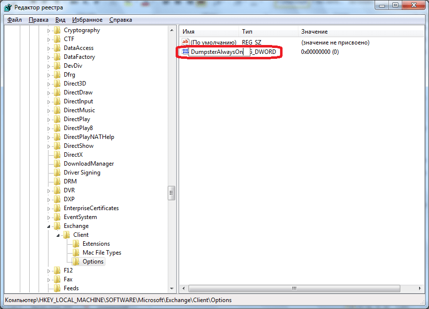 В поле созданного параметра вписываем «DumpsterAlwaysOn», и жмем кнопку ENTER на клавиатуре. Затем, двойным щелчком кликаем по этому элементу.