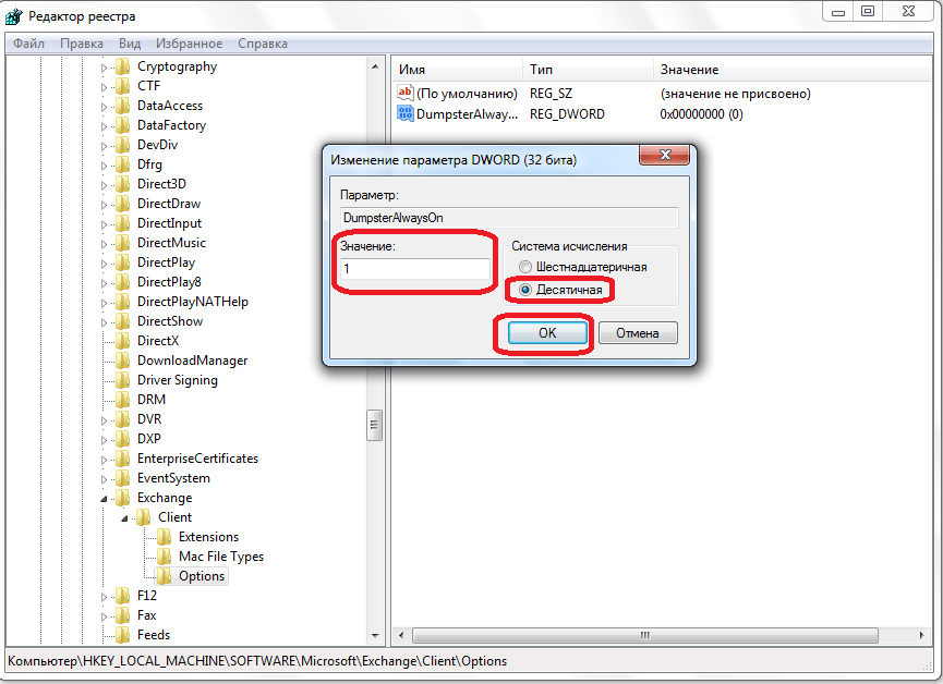 В открывшемся окне, в поле «Значение» ставим единицу, а параметр «Система исчисления» переключаем в позицию «Десятичная». Жмем на кнопку «OK».