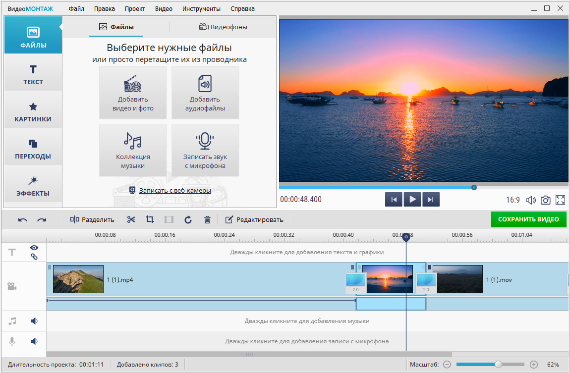 ВидеоМОНТАЖ – мощный редактор для обработки и преобразования видеофайлов. Он обладает большим набором профессиональных инструментов, но благодаря понятному принципу работы освоить его могут даже пользователи с минимальными техническими навыками. Программа работает со всеми популярными форматами видеофайлов, поэтому вы можете объединять в один фильм файлы с разными расширениями. Также можно применять фильтры, вставлять титры и заголовки, обрезать длину клипа и кадрировать файл. ВидеоМОНТАЖ не предъявляет повышенных системных требований и может использоваться для ПК и для ноутбука любой мощности.