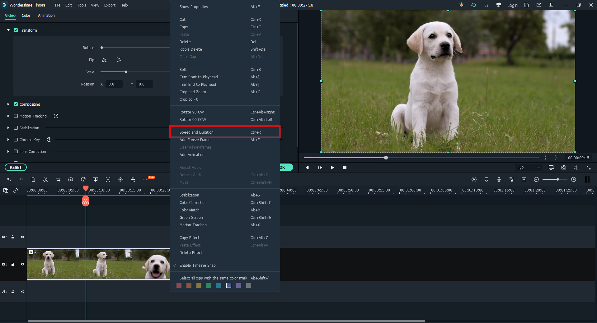 1. Кликните по ролику левой кнопкой мыши и найдите «Speed and Duration».