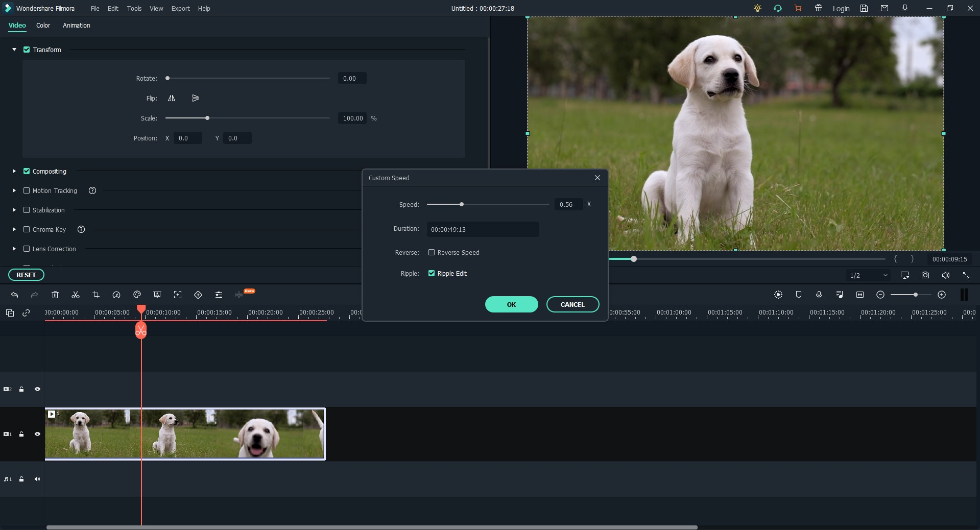 2. С помощью маркера выберите значение скорости или введите цифру справа. В окне «Duration» отобразится, сколько теперь длится клип. В пункте «Ripple» стоит галочка. Это значит, что после применения изменений ролик сдвинется вправо, а с ним и остальные фрагменты на таймлайне.