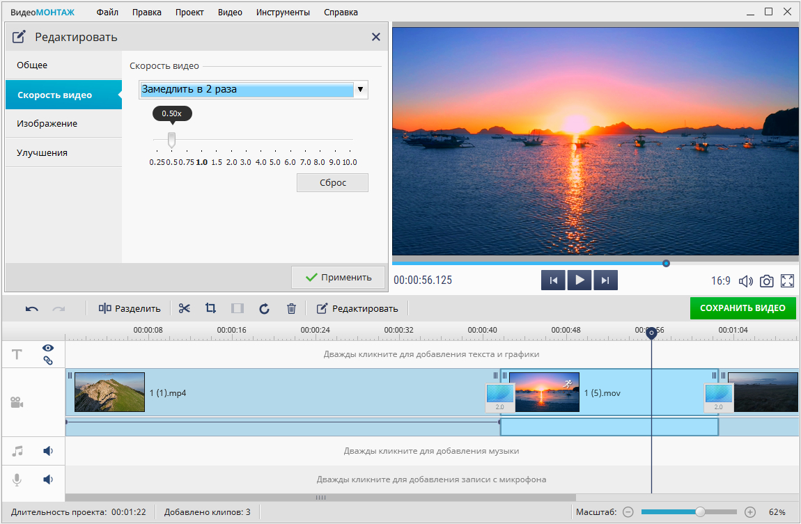 Пошаговая инструкция по ускорению/замедлению видео в ВидеоМОНТАЖ