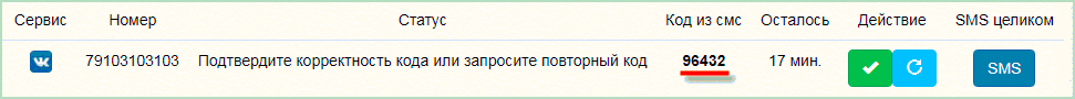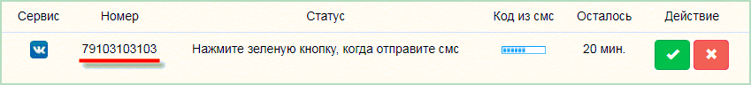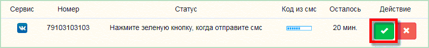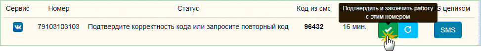 Возвращаемся во вкладку сервиса Sms-Activate и нажимаем на зеленую кнопку-галочку.