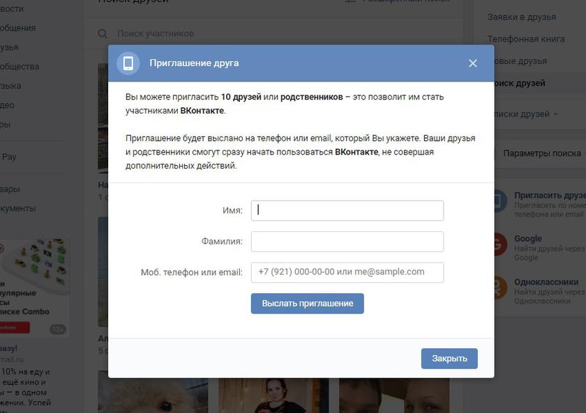 Форма приглашения на странице поиска друзей