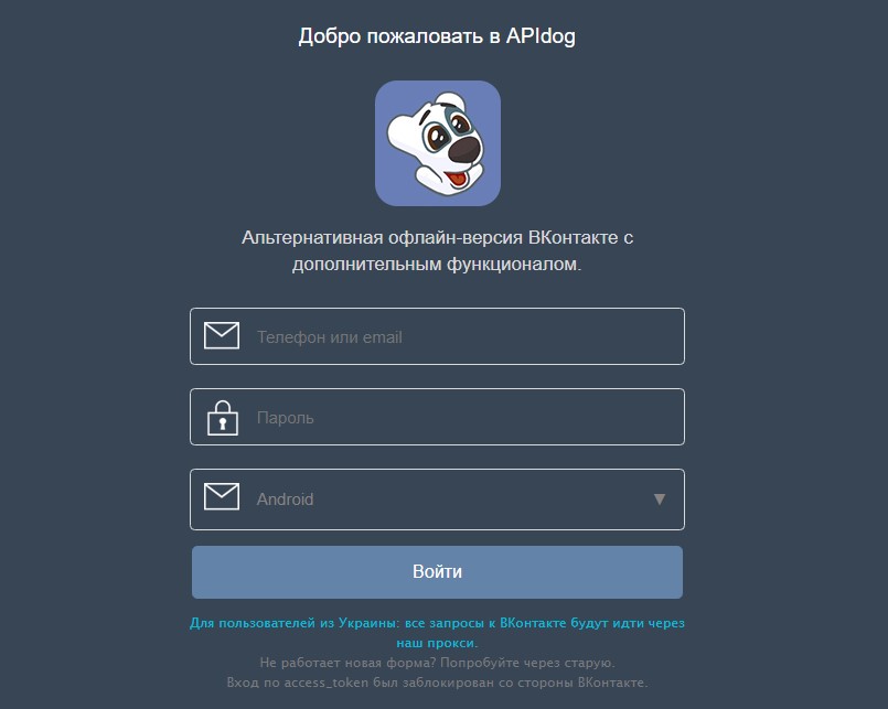Страница входа в аккаунт ВК через сервис Apidog