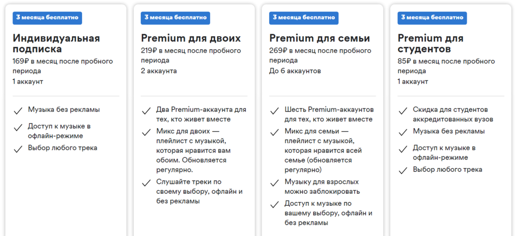 Снять все запреты и почувствовать всю прелесть прослушивания любимых артистов в этом приложении можно после того, как оформите одну из платных подписок. Всего их четыре: