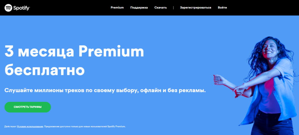 Если вы впервые пришли на цифровую площадку Spotify, тогда вам предложат оформить подписку Premium на 3 месяца полностью бесплатно, что позволит слушать музыку без ограничений на лучшей стриминговой платформе в России.