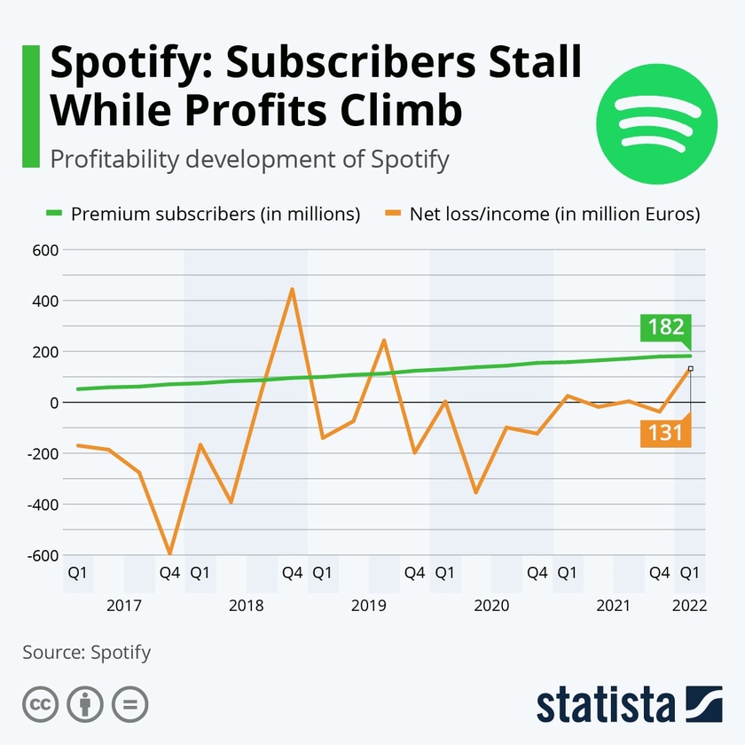 При этом общее число премиум-подписчиков Spotify по всему миру в апреле-июне 2022 года выросло на 14% — до 188 млн человек. Общее количество зарегистрированных пользователей выросло с 422 млн в начале года до 433 млн по итогам второго квартала 2022 года.