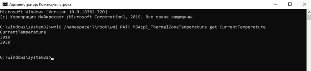 Аналогичное действие можно сделать через командную строку, также от имени администратора, чтобы не было никаких проблем с выполнением операций. Введите команду: wmic /namespace:\\root\wmi PATH MSAcpi_ThermalZoneTemperature get CurrentTemperature. Чтобы подтвердить действие нажмите Enter — анализ займет не больше 10 секунд.