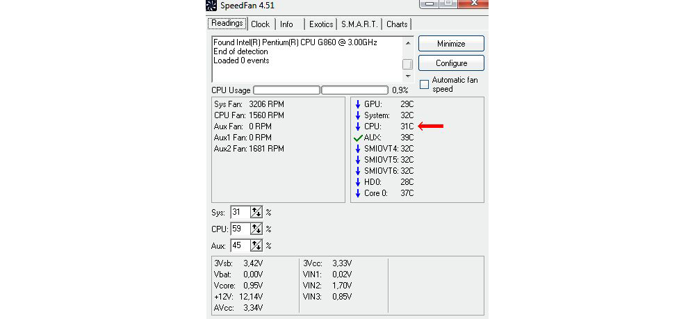 После установки программы перейти во вкладку «Readings» из основного меню и отследить скорость вращения вентиляторов охлаждения ПК. Также в Speed Fan можно узнать степень перегрева всех ключевых компонентов системы. Фишкой программы является наличие графиков, а также возможность ускорения скорости вентилятора для снижения нагрева CPU.