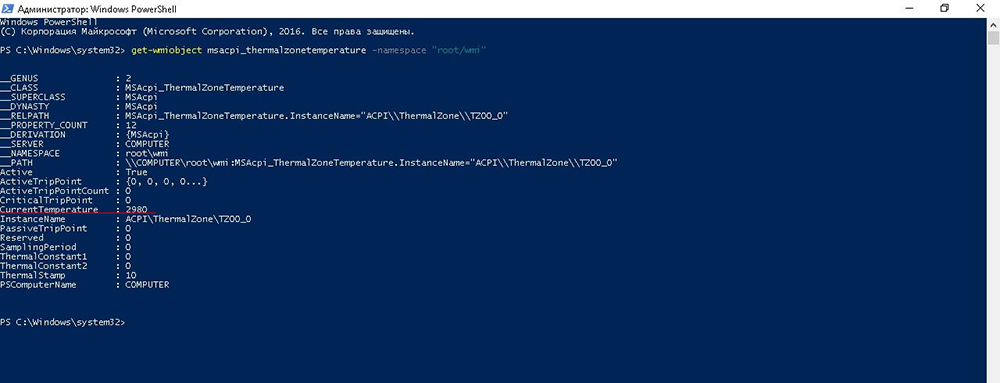 - Здесь следует использовать другую команду, а именно: get-wmiobject msacpi_thermalzonetemperature -namespace «root/wmi».