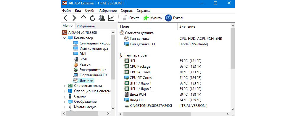 В открывшейся большой и страшной программе (кстати она на русском) надо перейти на вкладку «Компьютер — Датчик». Там Вы увидите все температуры компонентов Вашего компьютера.