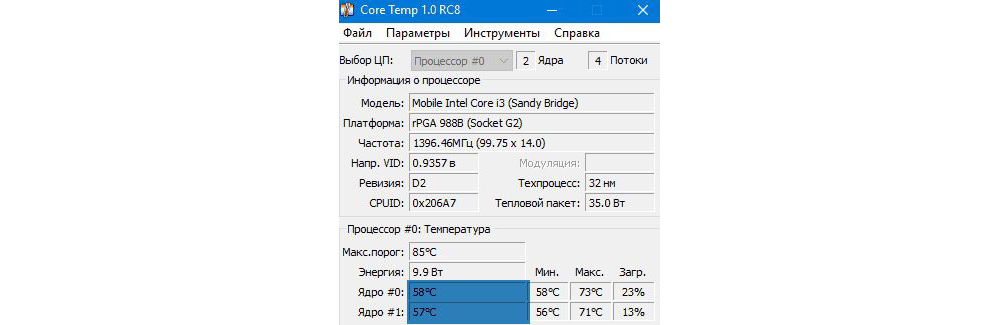 Программа Core Temp работает на процессорах Intel, AMD и VIA. Помимо показаний температуры ядра, приложение предоставляет данные о частоте, загрузке процессора и использовании оперативной памяти.