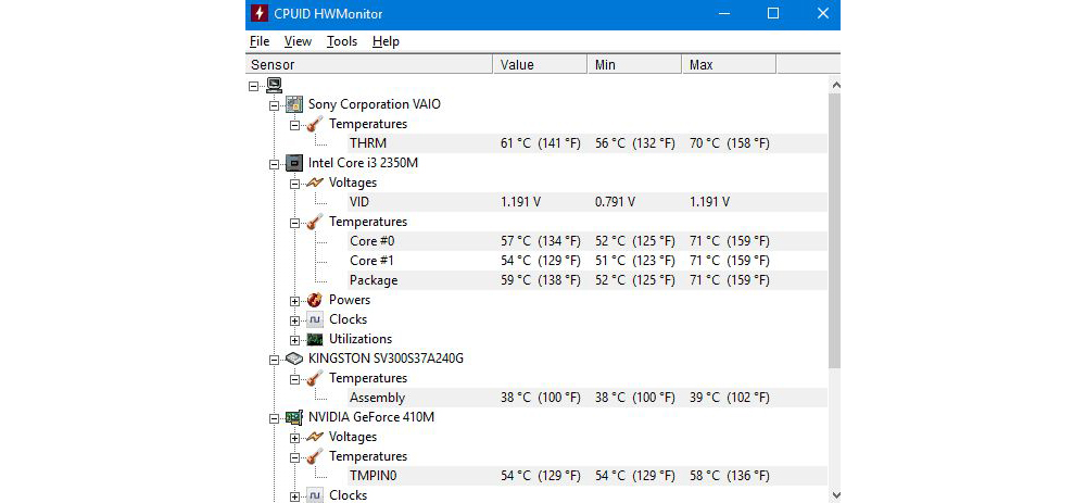 Отличное бесплатное ПО для проверки статуса аппаратных элементов ПК. Для просмотра температурных данных процессора достаточно установить утилиту, запустить, зайти во вкладку «Temperatures», расположенную в основном меню программы, – раздел «Sensor». Сведения о степени нагрева CPU отображаются в градусах Цельсия – параметр «Package». Можно узнать минимальную и максимальную степень нагрева ПК или ноутбука в столбцах «Min» и «Max», а также узнать текущее состояние в колонке «Value».