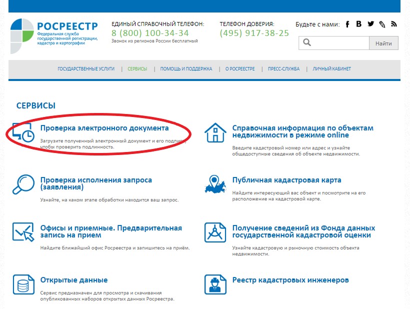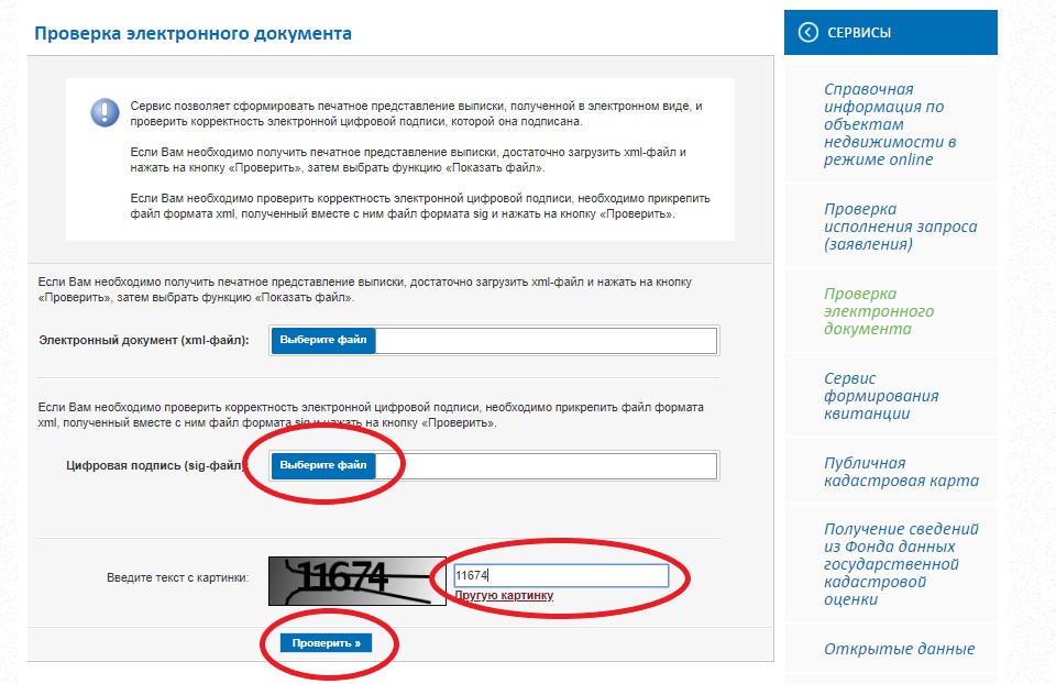 На сайте Росреестра есть сервис, позволяющий проверять электронные документы. Есть возможность проверить подпись на двух типах файлов: Цифровая подпись (sig-файлы) и Электронные документы (xml-файлы).