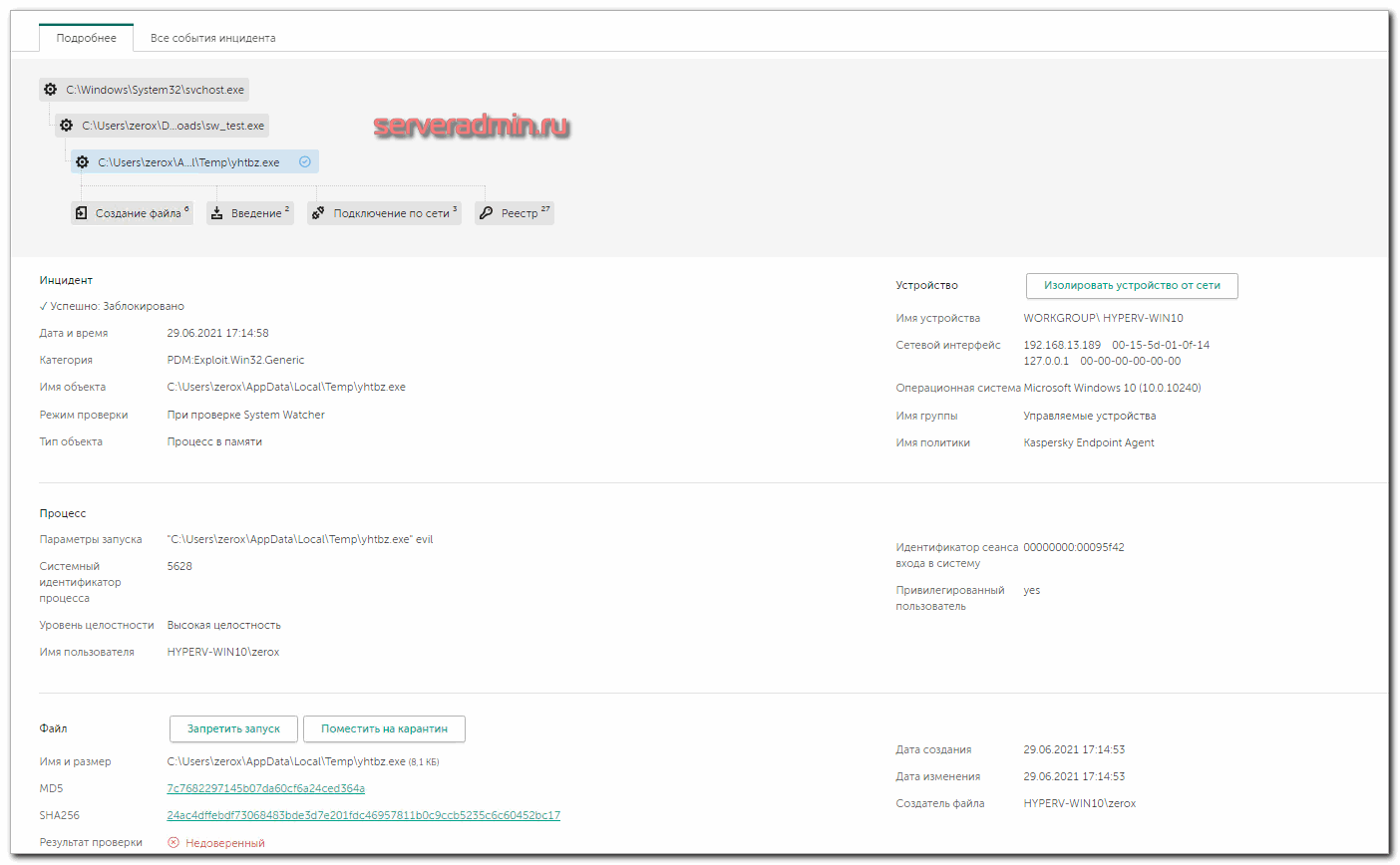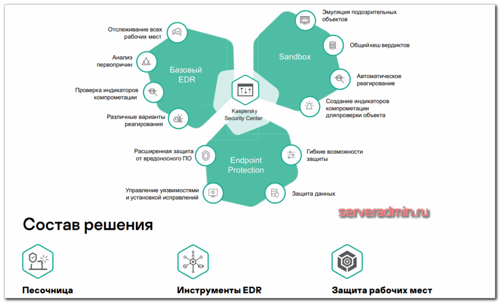 - Kaspersky EDR для бизнеса Оптимальный. Это расширение функционала Kaspersky Endpoint Security, который устанавливается в качестве антивируса на рабочие станции. С его помощью можно будет не только предотвращать угрозы, но и расследовать инциденты, анализировать первопричины заражений, автоматически формировать защиту на основе уже полученных данных, строить отчеты и многое другое. Ниже я буду устанавливать и настраивать этот продукт.