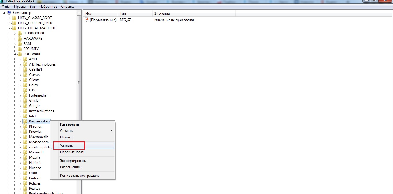 2 Дальше. Открываем системный реестр и находим в нем папку KasperskyLab . Точный путь HKEY_LOCAL_MACHINESOFTWAREKasperskyLab. Удалите ее . Да, УДАЛИТЕ , правой кнопкой.