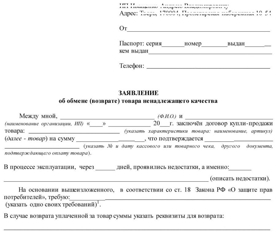 - заполненное заявление (иногда по форме, предоставляемой магазином);