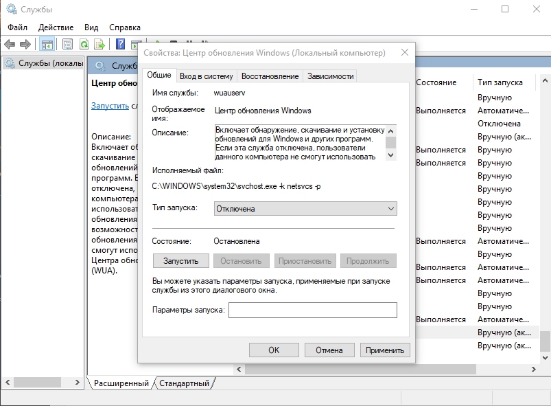- Затем в свойствах ЦО (окно вызывается из контекстного меню) во вкладке «Общие» выставляем режим «Отключена» в пункте «Тип запуска».