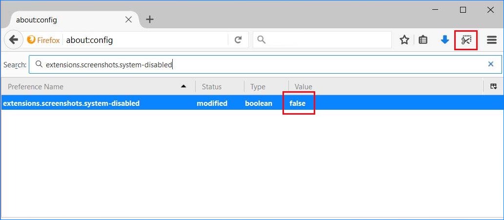 Изменение значения на «False» приведет к тому, что будет выключена блокировка создания снимков экрана и на верхней панели инструментов (рядом с иконками меню, закладки, загрузки и других) появится новый значок.