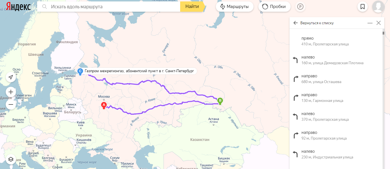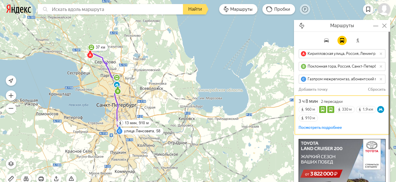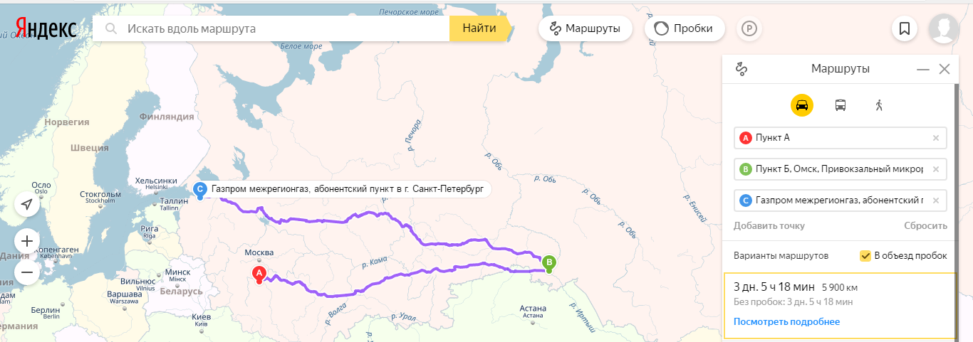 Система построит маршруты, варианты которых отобразятся в окошке ввода пунктов назначения.
