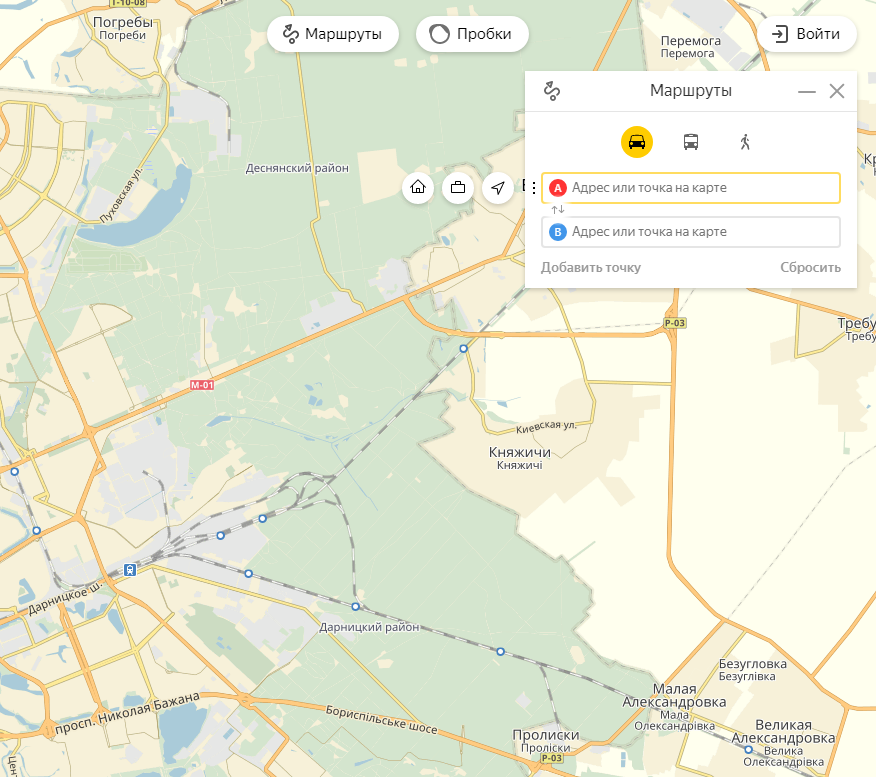 В верхней части экрана вы увидите оранжевую строку ввода адреса, а справа от нее две кнопки – Маршруты и Пробки. Вам, в данный момент, необходим сервис Маршруты.
