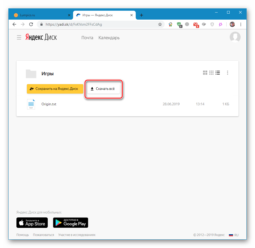 Если ссылка указывает не на отдельный файл, а на папку с файлами, то при клике по ней папка откроется в окне, позволяя вам увидеть список находящихся в ней файлов. Вы также можете либо сохранить ее в своем облачном хранилище, либо скачать архивом на жесткий диск. Во втором случае следует кликнуть по кнопке «Скачать все». Архив будет скачан в папку Загрузки.