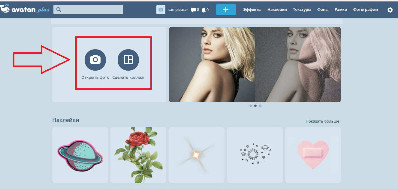 На главной странице сервиса в верхнем меню есть ряд ссылок: Эффекты, Наклейки, Текстуры, Фоны, Рамки, Фотографии. Разберем что это такое как этим всем пользоваться.