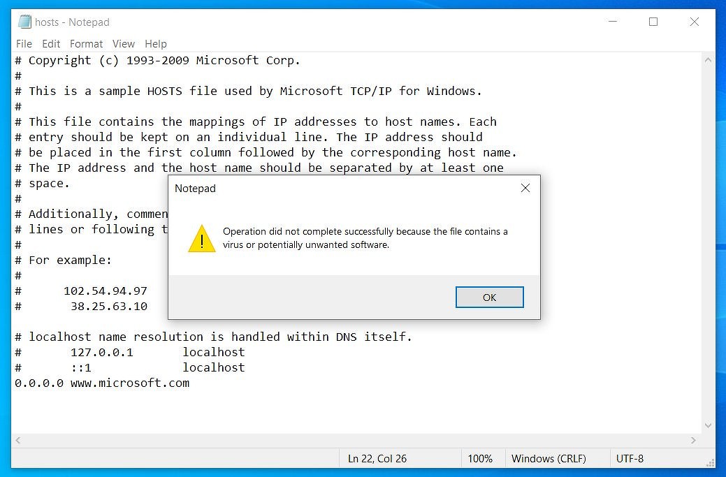 Результаты тестов, проведенных специалистами издания, показали, что теперь, если пользователь просто попытается сохранить измененный файл hosts, он получит предупреждение о том, что «операция не была завершена успешно, поскольку файл содержит вирус или потенциально нежелательное ПО».