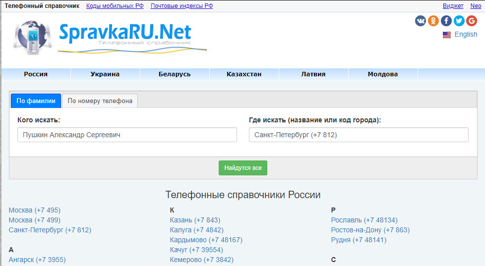 SpravkaRU.Net — весьма объемный телефонный справочник, который может искать также по ФИО.