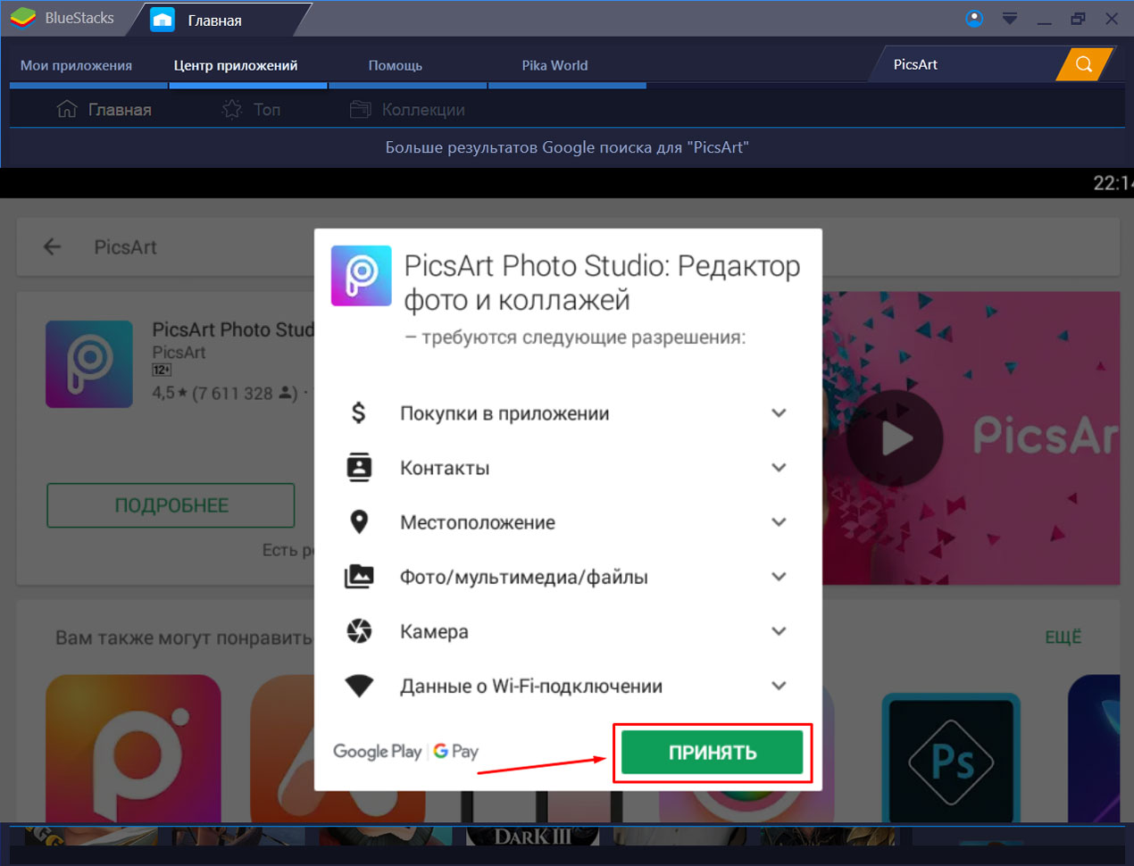 Переходим к главному моменту этого обзора – запуску PiscArt на ПК. Самый лучший вариант заключается в установке эмулятора операционной системы Android, который называется Bluestacks 3. Это ПО существует не первый год, разработчики авторитетные, им можно доверять.
