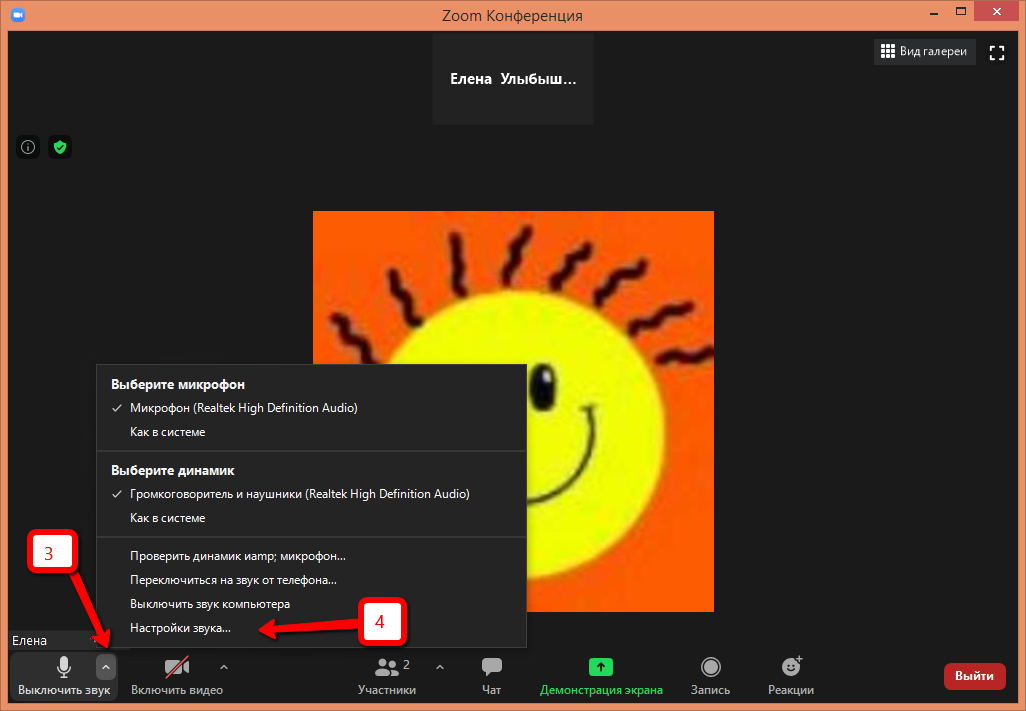 Войдя в конференцию, нужно перейти в настройки звука. Для этого нажать на иконку стрелки (3) правее кнопки «Выключить звук». Во всплывающем меню выбрать пункт «Настройки звука…» (4).