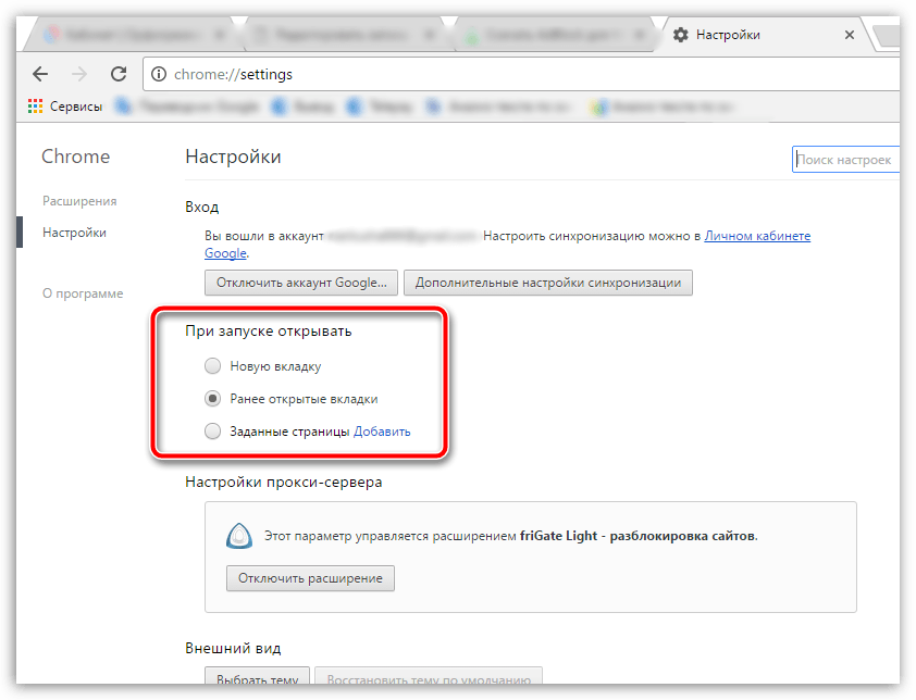 Следом потребуется либо установить собственные страницы, либо же установить наиболее удобный режим запуска Google Chrome – «Ранее открытые вкладки».