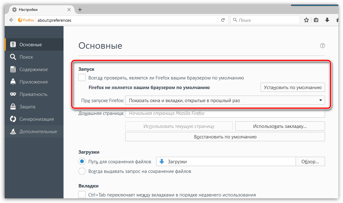 В блоке «Запуск» около пункта «При запуске Firefox открывать» отметьте либо пункт «Показать окна и вкладки, открытые в прошлый раз», либо «Показать пустую страницу». Если необходимо, внесите изменения, а затем закройте вкладку настроек браузера.