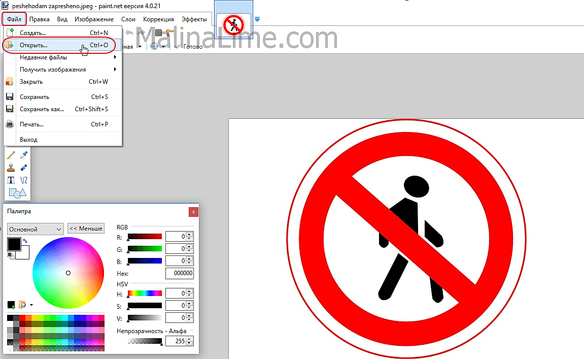 Откройте файл содержащий изображение, которое Вы хотите использовать в качестве водяного знака. Открывается файл стандартно. Кликните по «Файл», в главном меню, затем, в раскрывшемся меню «Открыть…» или нажмите Ctrl+O. В появившемся окне проводника выберите нужный файл. Пусть в нашем примере это будет дорожный знак.